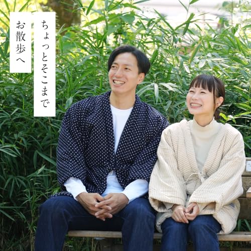 おしゃれが気になる年代の方に特におすすめしたい一着なんですよね。無地に見えるんですけど、実は繊細な白糸が織り込まれた凝った生地が使われていて、近くで見ると本当に美しいんです。男女兼用サイズなので、ご夫婦やカップルでお揃いにすることもできますし、通常より袖下がカットされたスリムなシルエットが体にフィットしやすくて、着ぶくれしないのが嬉しいポイント。表地・裏地とも綿100%なので肌触りも柔らかくて、敏感肌の方にも安心しておすすめできます。個人的にすごく気に入ってて、スタイリッシュな半纏をお探しの方には必ずご紹介している商品です。