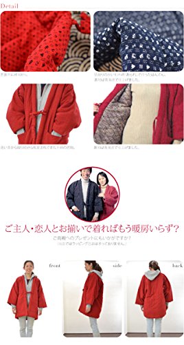 ホワイトダックダウンとフェザーを使用していて、長時間着用しても肩が凝りにくいのが本当に助かるんです。お尻までしっかり包みこむ丈の長さなので、下半身の冷えが気になる方にも安心してお使いいただけます。表地は綿100%の麻の葉柄で、落ち着いた赤みのエンジとシックな紺の2色から選べるのも魅力。男女兼用フリーサイズなので、ご夫婦お揃いで着ることもできて、プレゼントにも喜ばれる商品ですね。結び紐で前をしっかり閉じることができて、2つ付いた前ポケットが小物を入れるのに役立つという実用性も備えています。